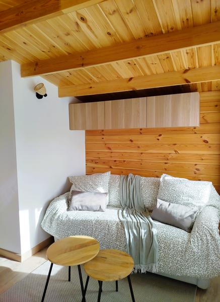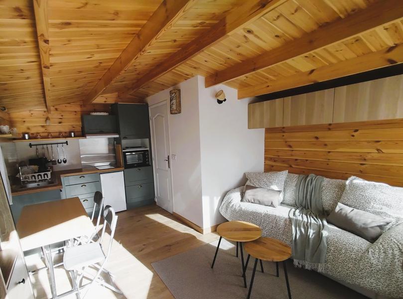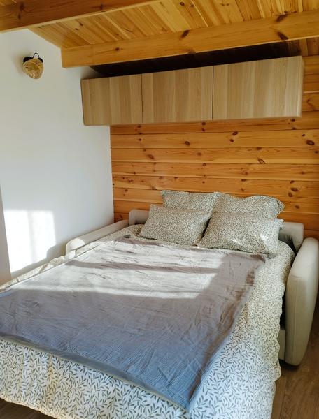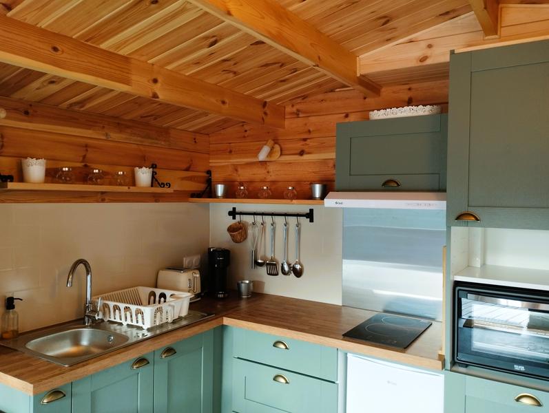 Le chalet blanc Artémisia dispose d'une cuisine aménagée toute équipée avec un coin repas, d'un salon avec un canapé lit pour 2 personnes (super confortable !) et d'une salle de bain avec un agréable espace de douche à l'italienne. Ce petit cocon de 20m2 aménagé avec goût est idéal pour une parenthèse cocooning en pleine nature. Vous profiterez du salon de jardin privatif sur la terrasse pour déjeuner en admirant la montagne, le coucher de soleil et les étoiles. Souvenirs inoubliables !